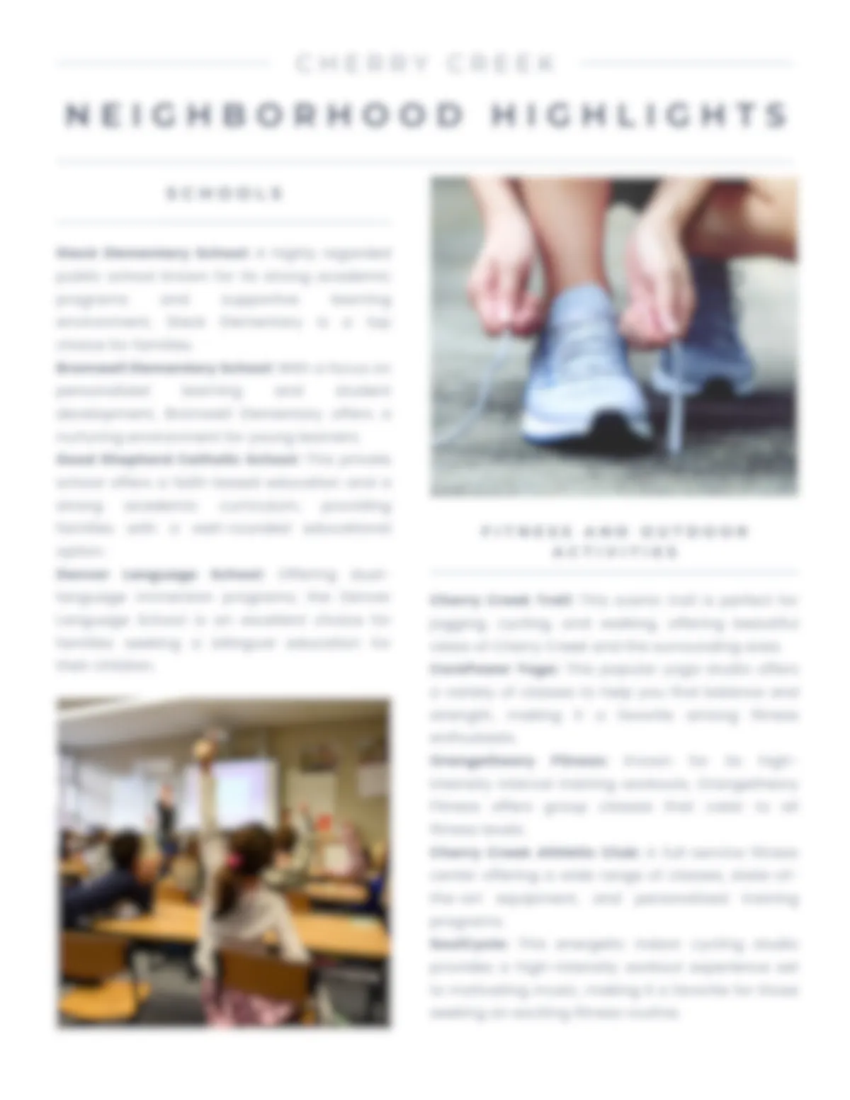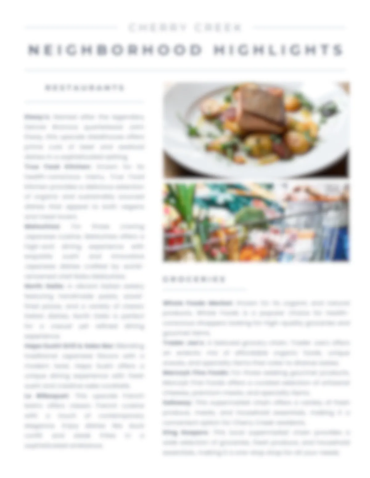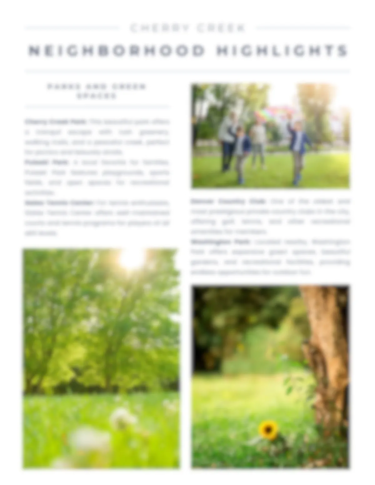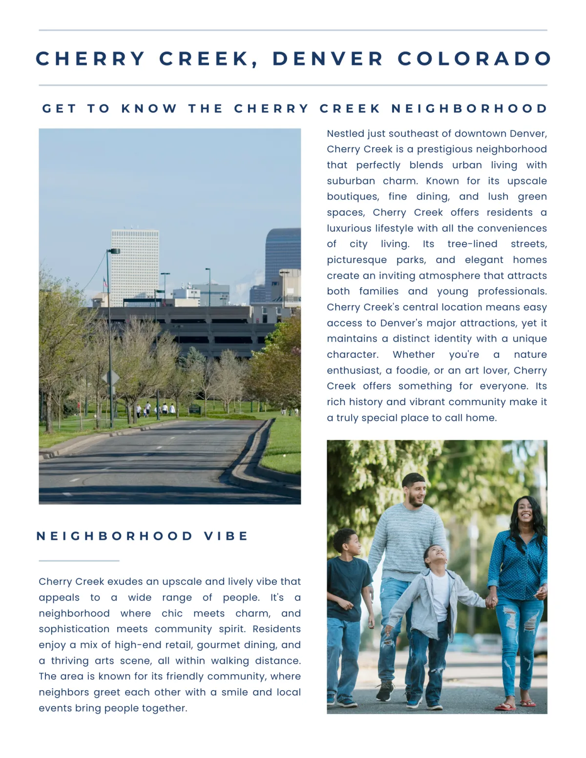 Cherry Creek offers an upscale, vibrant lifestyle with a mix of luxury shopping, trendy dining, and scenic outdoor spaces. Known for its walkable streets, high-end boutiques, and art galleries, Cherry Creek is a lively hub for those seeking a blend of urban excitement and suburban comfort. Get your free Cherry Creek Neighborhood Guide now!