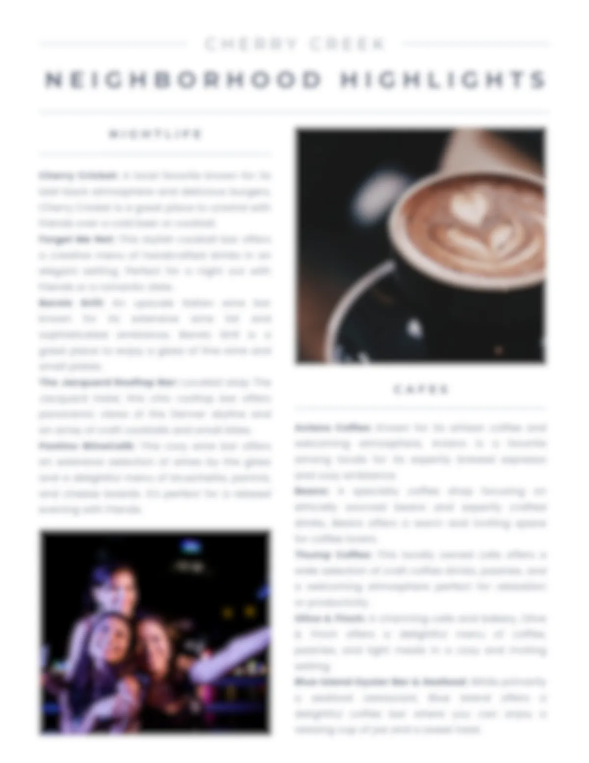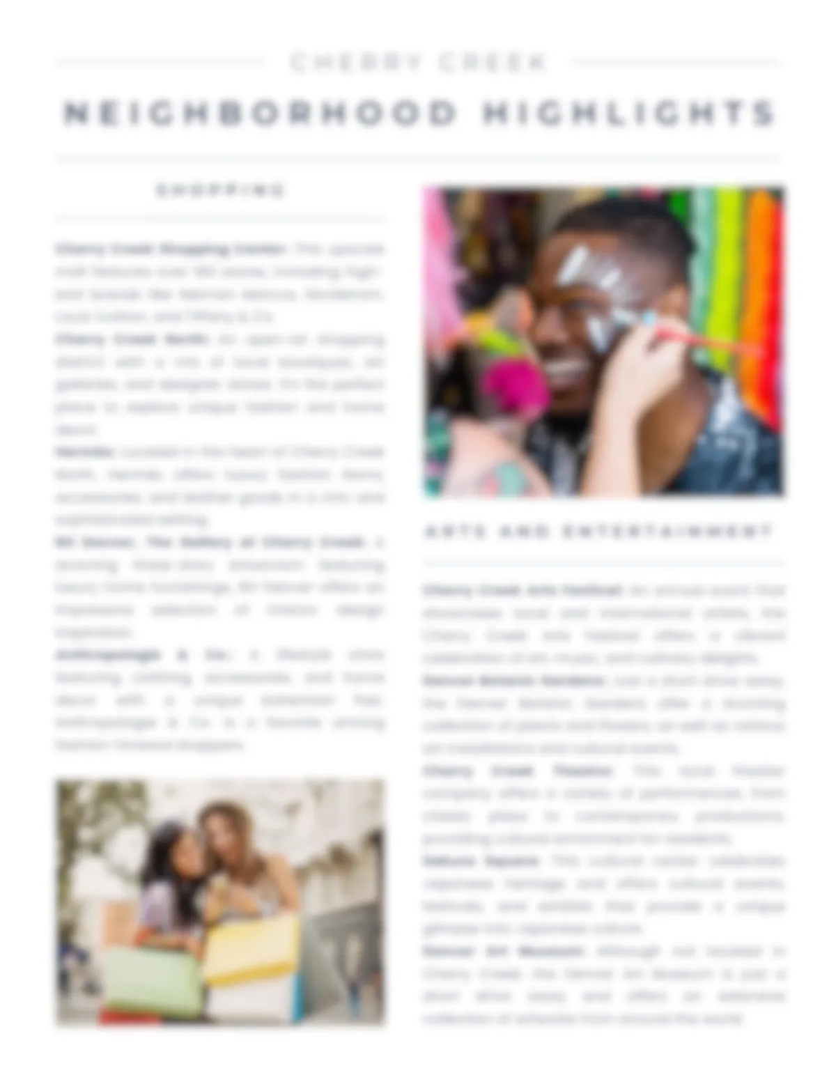 Fill out the form below and you'll automatically be directed to our Cherry Creek Neighborhood Guide.
